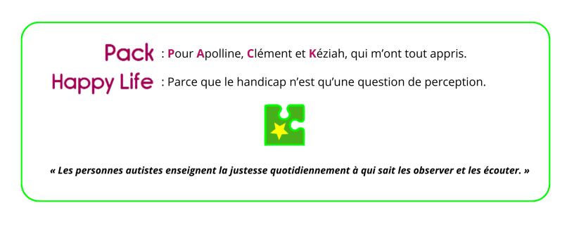 Le Pack Happy Life est né de mon envie de partager mon expérience dans l’autisme. J’ai donc créé ce pack vidéos sur Youtube afin de proposer gratuitement quelques astuces éducatives.